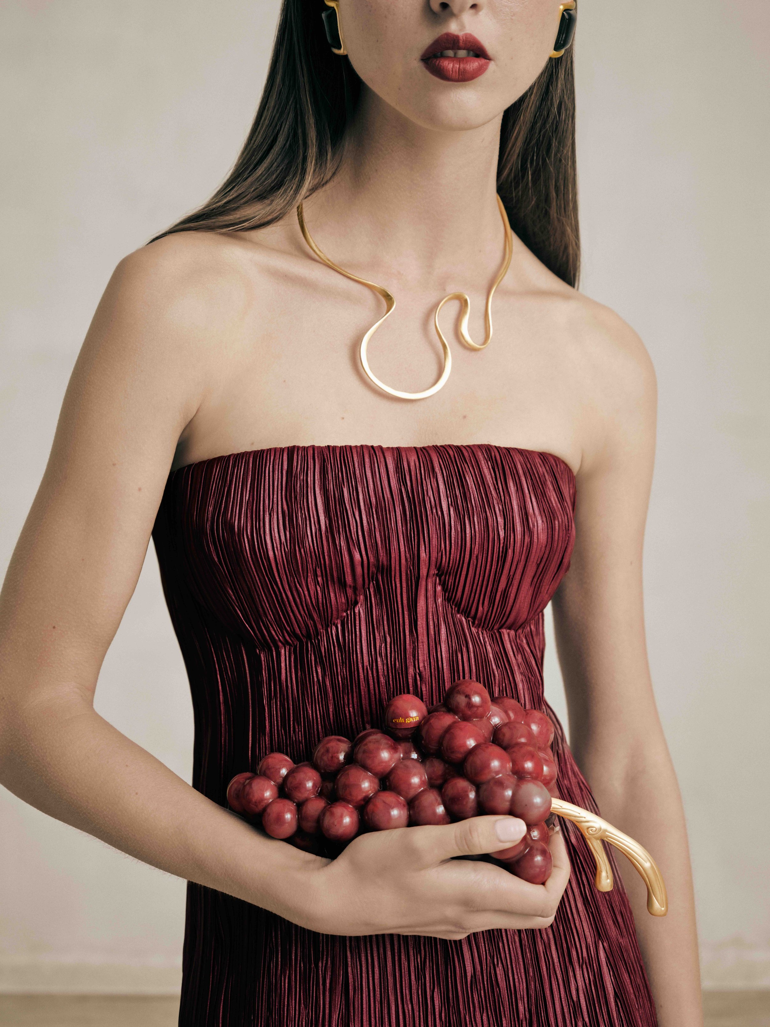 Left: Cult Gaia Grape clutch ($598), Jamisha gown ($2,498) and Suni choker ($398; cultgaia.com).